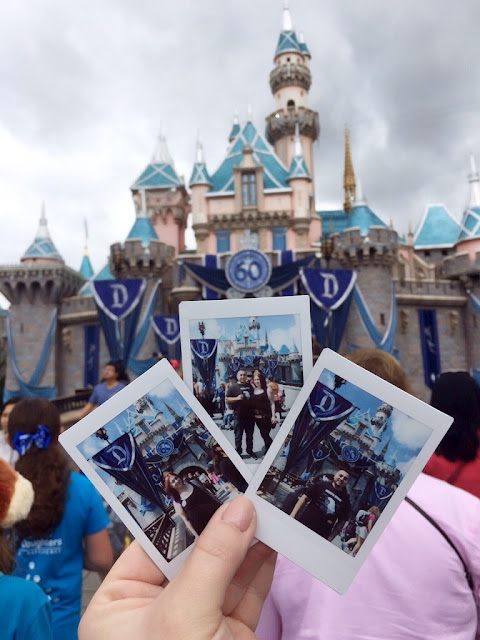 Saturday kinda seems like a blur to me. Right, when we arrived at Disneyland I spotted Minnie in her 60th Anniversary dress and told Rudy we had to get at least one photo with her and Mickey in them! We stopped and quickly snapped some pictures then took off to Starbucks to get some coffee. We headed to the castle on our first day there we took pictures with my Polaroid camera and I wanted to get a photo me holding them in front of the castle.