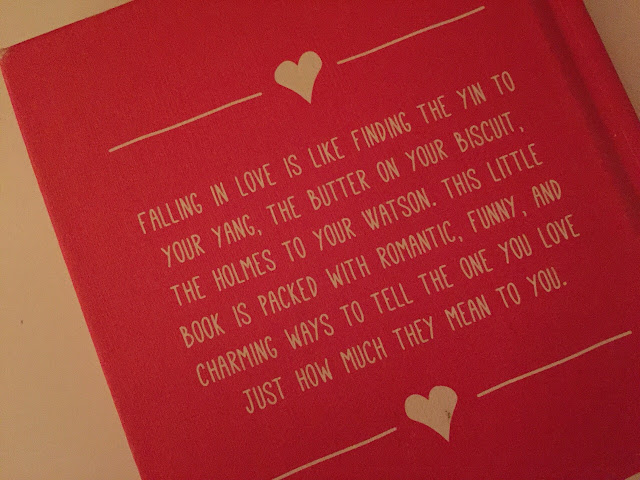 Last month while I was at Marshall's I came across this really cute little book filled with cute little love phrases. This book is filled with tons of cuteness and along with funny little phrases/quotes from a lot of familiar movies. I really enjoyed reading it and it only took me about 5-10 minutes. It was really cute and kept a smile on my face the entire time reading it, along with thinking of Rudy every time I turned the page.