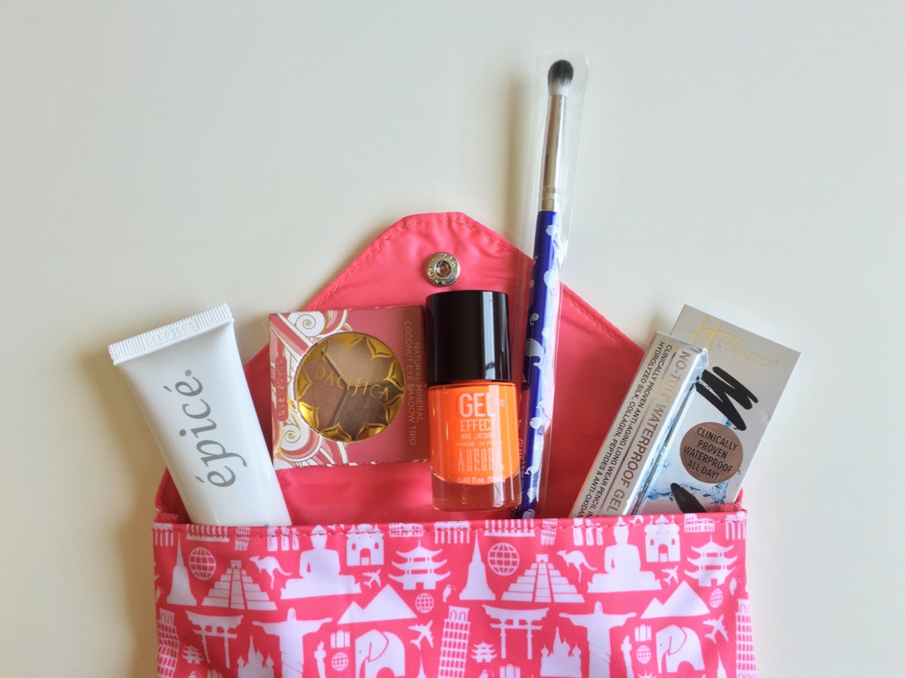 First I wanted to start off by talking about the bag. I have never cared for the bags Ipsy send out, like ever. However they have been on point with them lately. I usually give them away to friends or my mom but I have been actually saving the ones from these last few months. March's bag was my absolute favorite of them all and I now carry my camera inside. Ok I'm getting off track here, so this months bag I believe they sent out different shades again like they have done in the past. When I got the email stating my bag had been shipped there was a picture of a blue bag with this same white print. Once I opened my my package it so happened to be a pink bag which I ended up really liking. One of my friends even mentioned that she had see that someone received a purple bag. I really like that Ipsy has been sending out different shades of bags I think it makes it that more exciting to see which one you're going to receive.