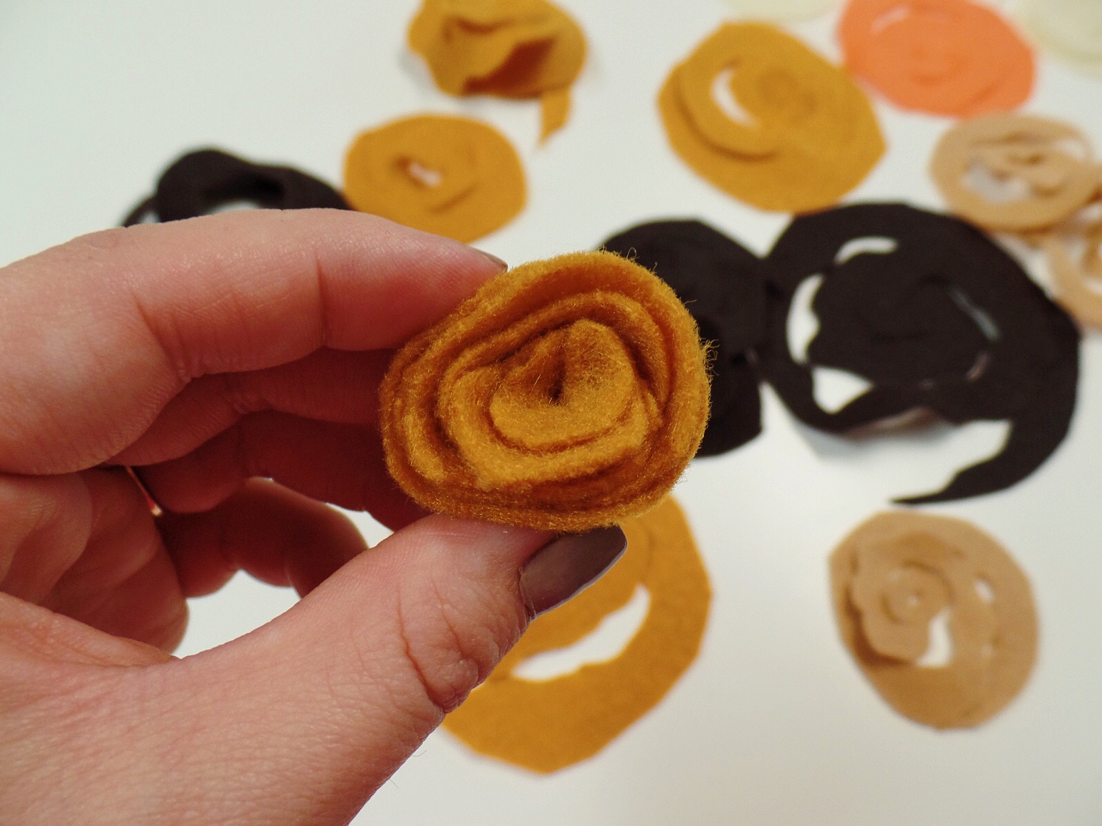 When you're done cutting your felt grab the center of the spiral felt and start twisting the rest of the felt around it. Here you will also start to hot glue the felt as you go. Be careful! I burned my fingers a lot while doing this.