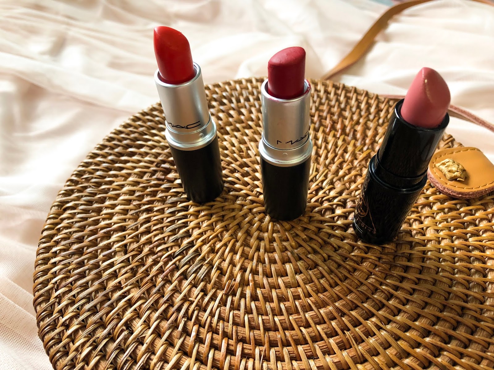 As for lipstick, I give myself three options. The shades I always travel with is a red, red-orange, and a nude. These MAC shades are my go-to and most times I'm wearing either one of these colors. Left to right; Lady Danger, Ruby Woo, and Only You; a limited edition shade.