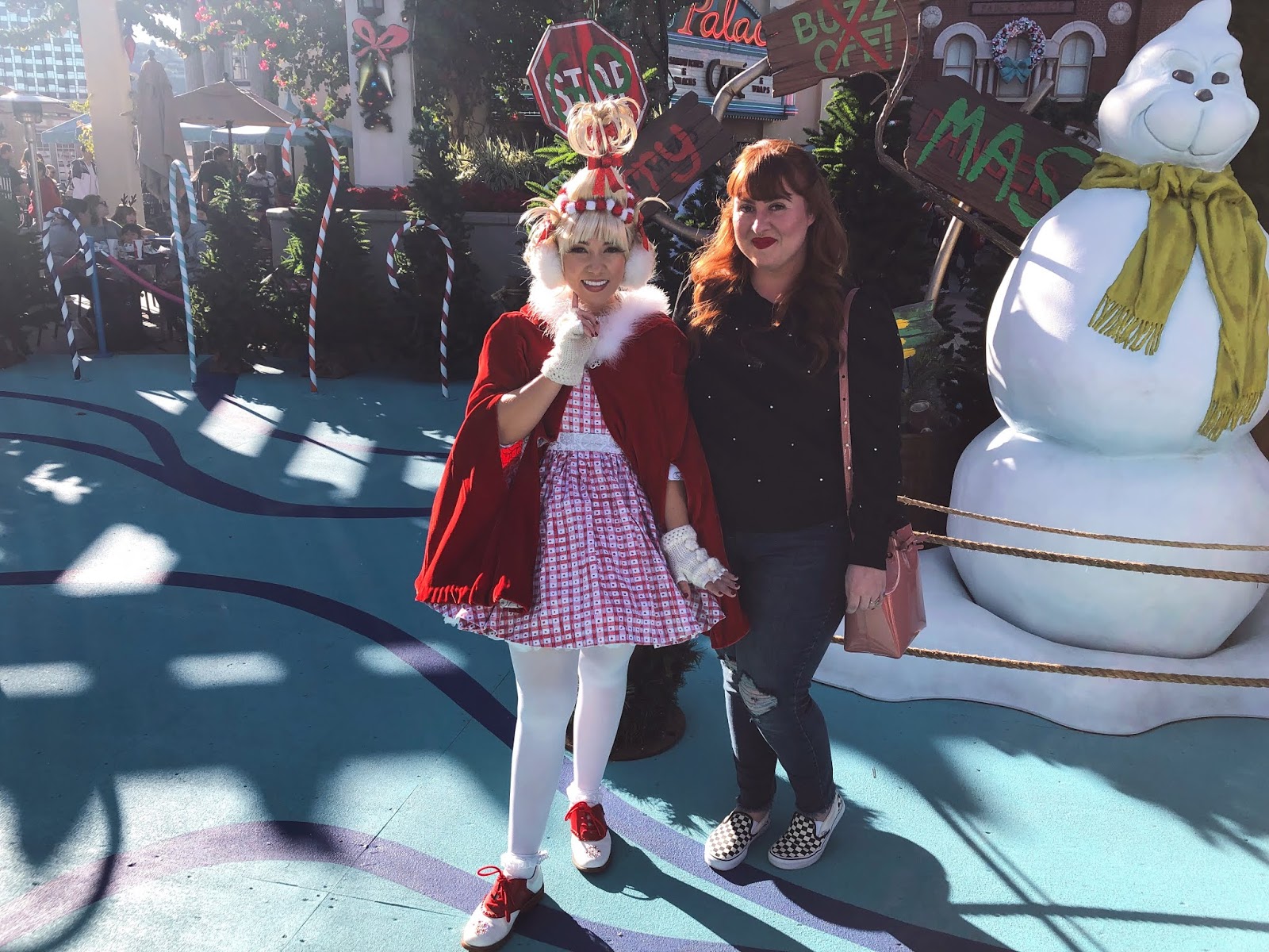Immediately after meeting the Grinch we ran into Cindy Lou Who! It was absolutely perfect. Cindy Lou is so sweet and so freaking adorable. She was telling me how it smelled like gingerbread cookies and she really liked my red nails. She added that they matched my lipstick, even her nails, and dress too. Her outfit was pure perfection, I was bummed they didn't have a clothing store in Whoville because I would have been in line waiting to purchase her outfit. I mean look at her shoes!