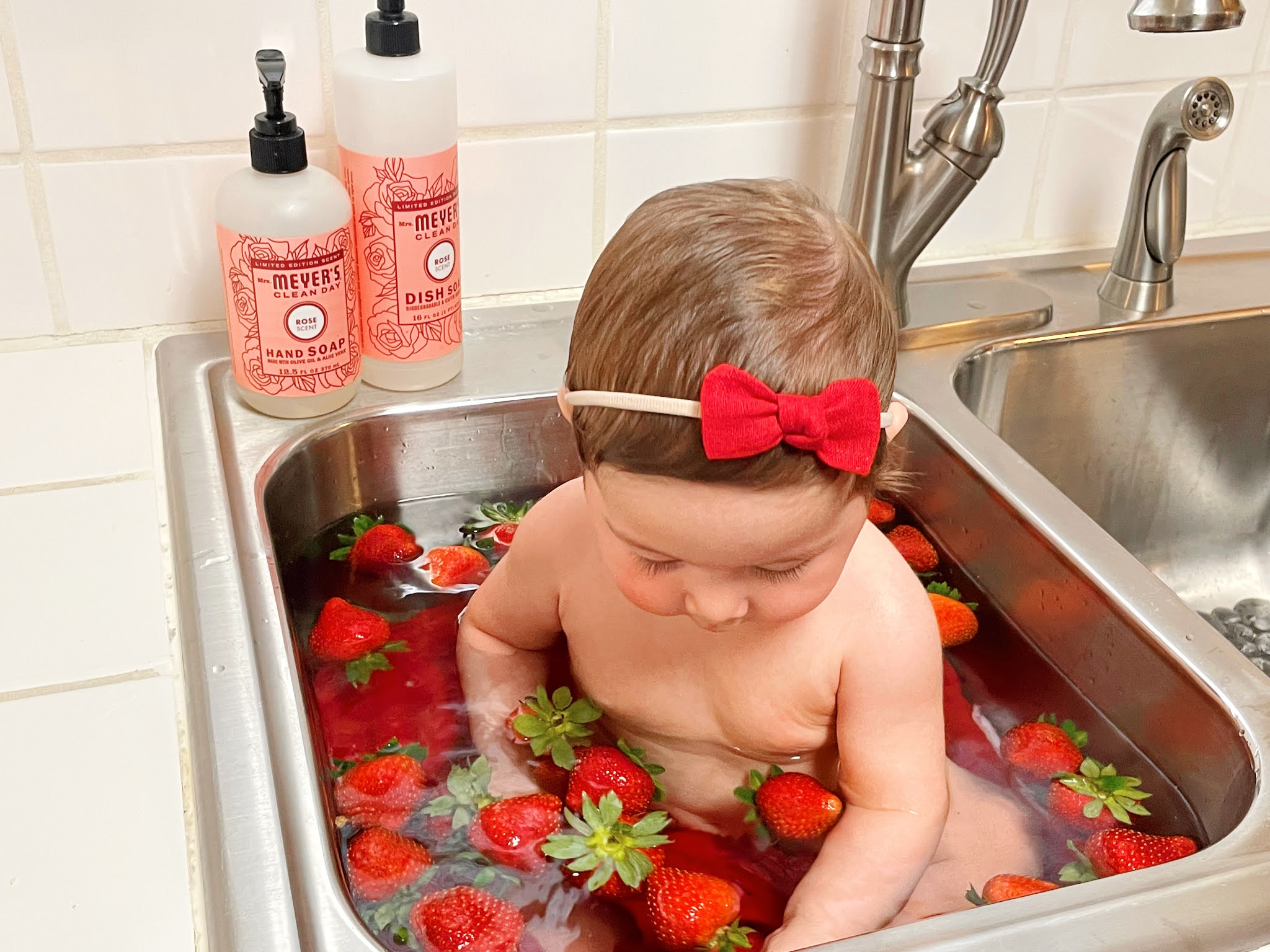 Since before I was pregnant I saw the most beautiful photo on Pinterest of a strawberry blond little girl in a kitchen sink filled with strawberries. That was such a precious photo that left me so inspired to do the same with my daughter one day. I kept that photo saved and always told Rudy that I wanted to do something similar one day. Since giving birth to Lucy, I kept reminding Rudy that as soon as Lucy is capable of sitting up on her own we need to purchase a bunch of strawberries and do a photo shoot. The past weekend we finally did and you guys, the photos are the most precious! Not only did I manage to capture dozens of beautiful photos of Lucy, but she was having the best time. Lucy is such a water baby, she loves anything that has to do with water; bath time, swimming, water activities, and even her new splash pad. This photoshoot in which consisted of her sitting in a sink, filled with water with countless strawberries that she could grab and eat was perfect for her.